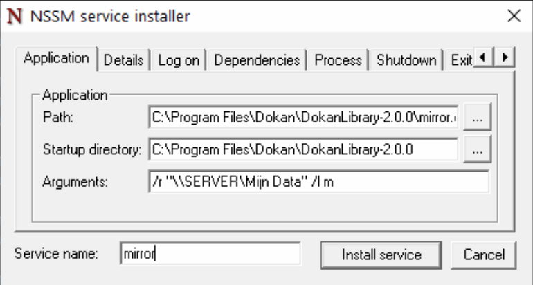 Gebruik commando “nssm.exe install mirror” en voeg de service toe. Gebruik dan als atribute: /r “\SERVER\Mijn Data” /l m.